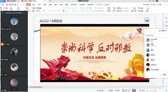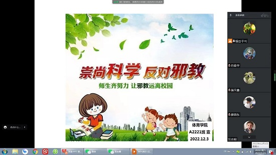 为进一步增强开云kaiyun官方网站学子反邪教意识,保护身心健康,培养爱国情怀。12月3日晚,开云kaiyun官方网站组织各班召开“崇尚科学,反对邪教”主题班会,因疫情原因,本次班会采用线上召开。