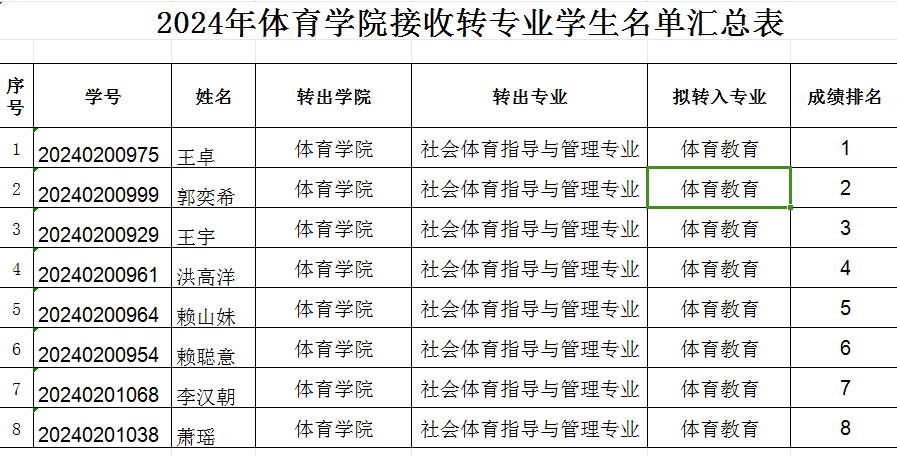 根据《九江学院学生转专业管理办法(试行)》九院字【2024】1体育教育专业的转入计划从高分到低分确定转入名单,拟批准2024级社会体育指导与管理专业的8名学生拟转入体育教育专业,名单公示如下: