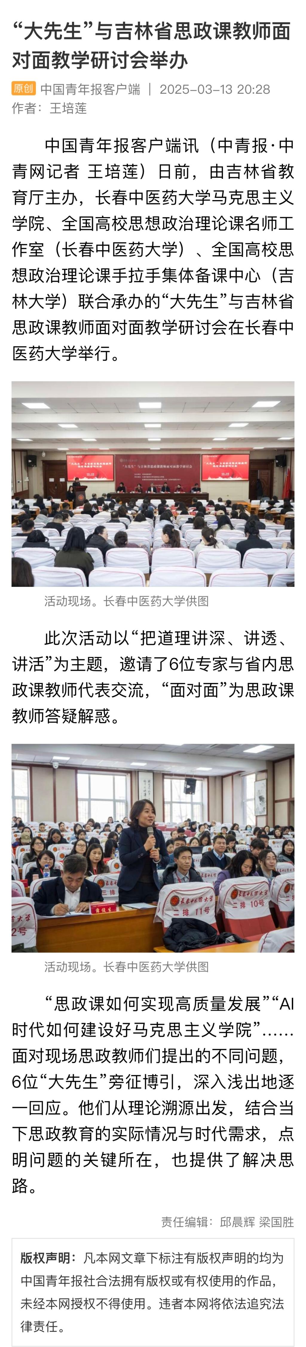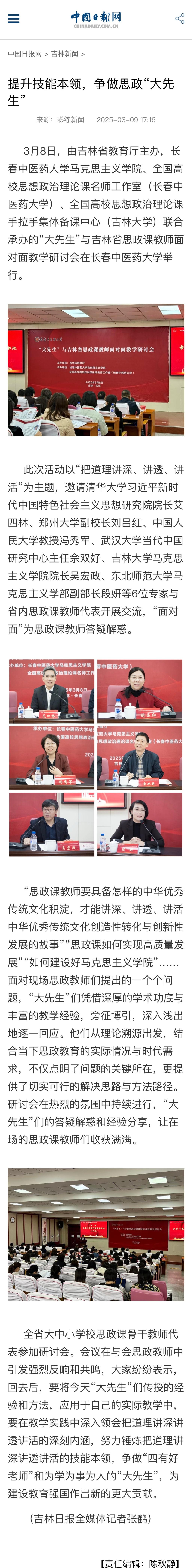 近期,人民网、中国青年报、中国日报网、中国社会科学报等重要媒体报道学院组织的“‘大先生’与吉林省思政课教师面对面教学研讨会”活动。