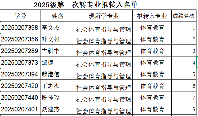 根据《九江学院学生转专业管理办法(试行)》九院字【2024】111号文件精神,体育教育专业的转入计划采用考核的方式,按照考核成绩从高分到低分确定拟转入名单,拟批准2025级社会体育指导与管理专业的8名学生拟转入体育教育专业,名单公示如下: