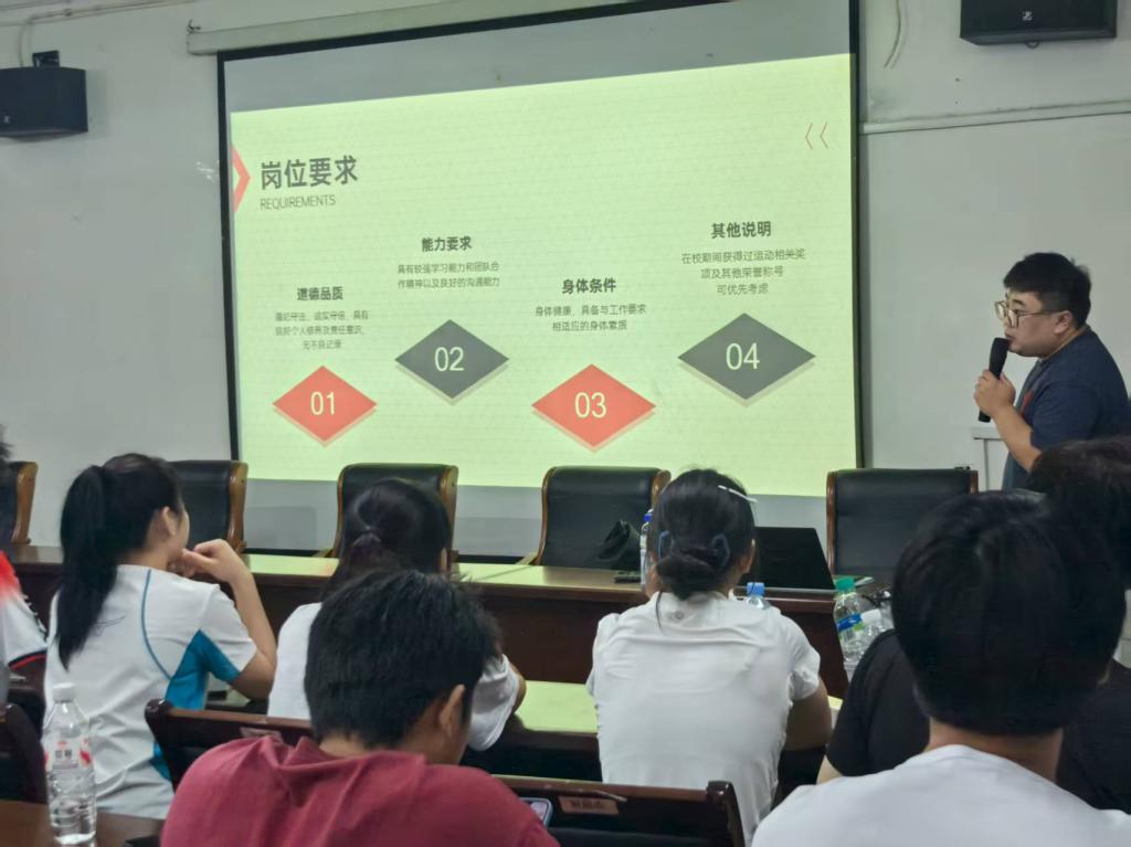 公司宁波橙星体育有限公司招聘负责人通过精彩的PPT 展示,详细介绍了企业的发展历程、企业文化以及业务范围。在招聘岗位介绍环节,公司针对开云学生的专业特点,提供了一系列极具吸引力的岗位,如羽毛球教练、羽毛球赛事策划专员等。对于每个岗位的职责、任职要求以及薪资福利,招聘负责人都进行了耐心细致的讲解,让学生们对岗位有了清晰的认识。