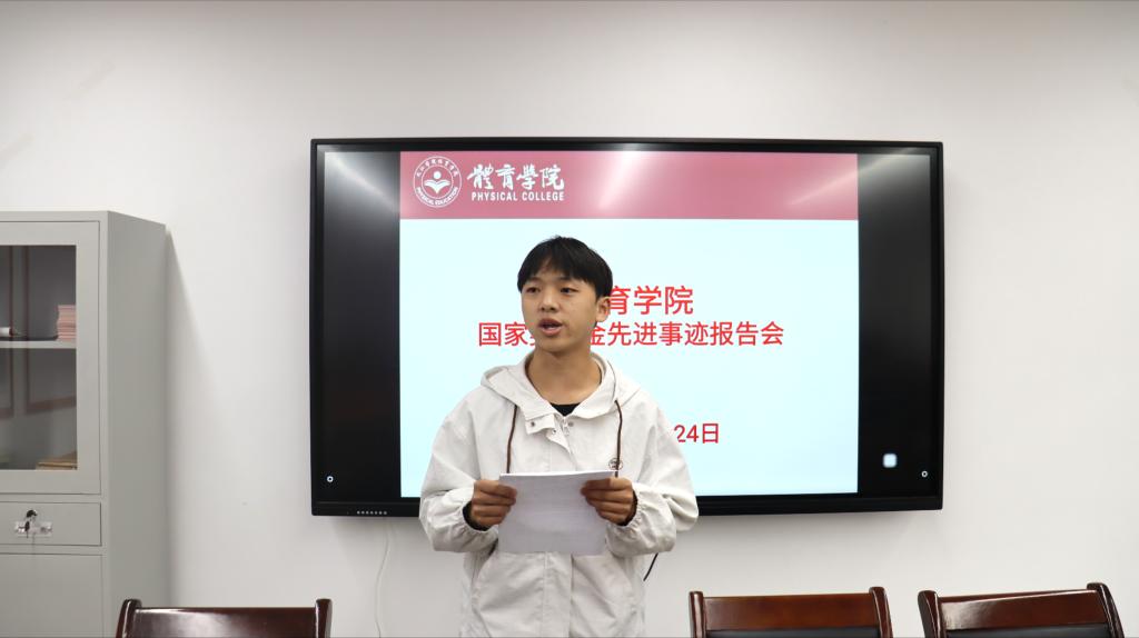 会上,学院学生管理科科长路鹏致辞,他首先祝贺两位同学获此殊荣,指出国家奖学金是对个人素养与学院培养质量的双重认可,希望参会同学认真汲取经验,努力成长为优秀体育人才。